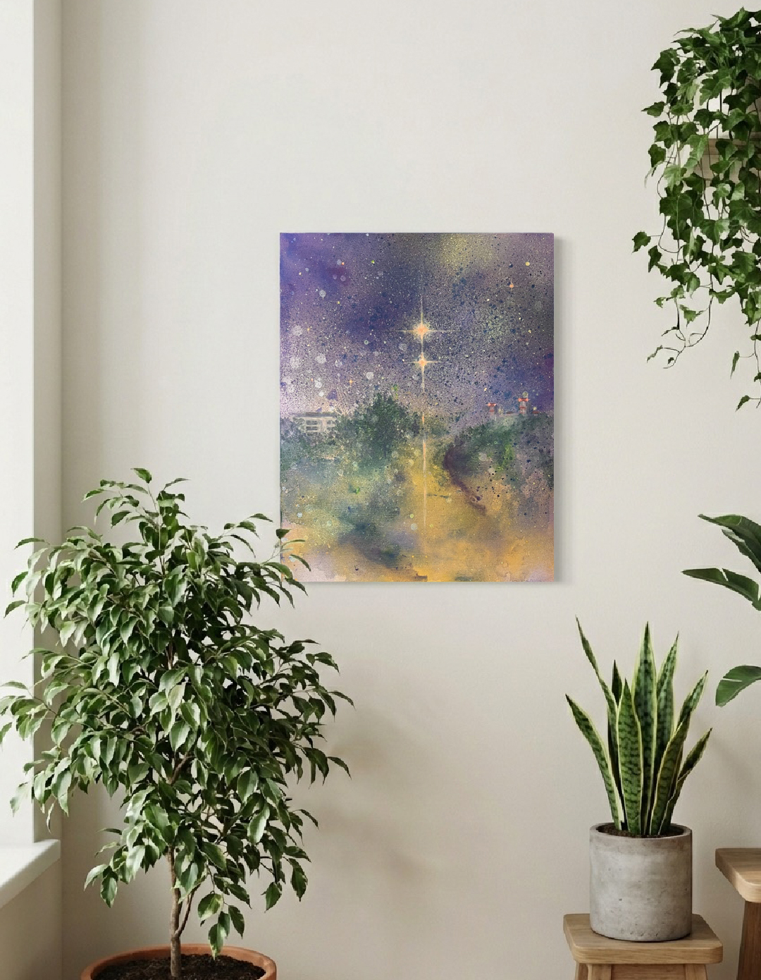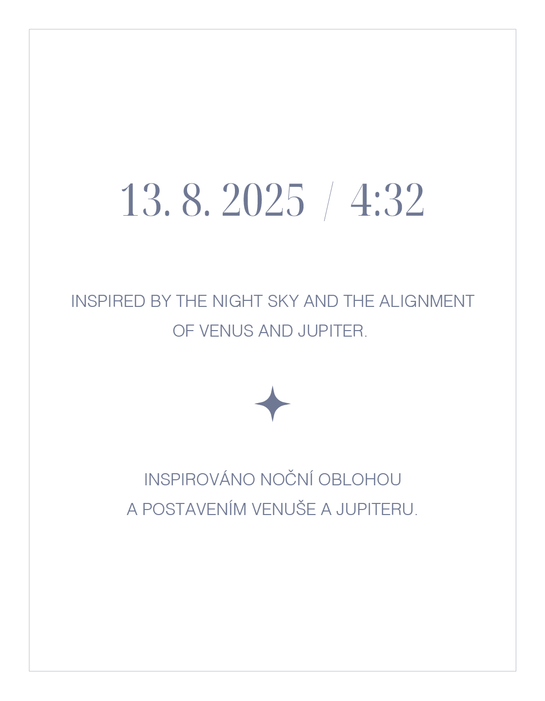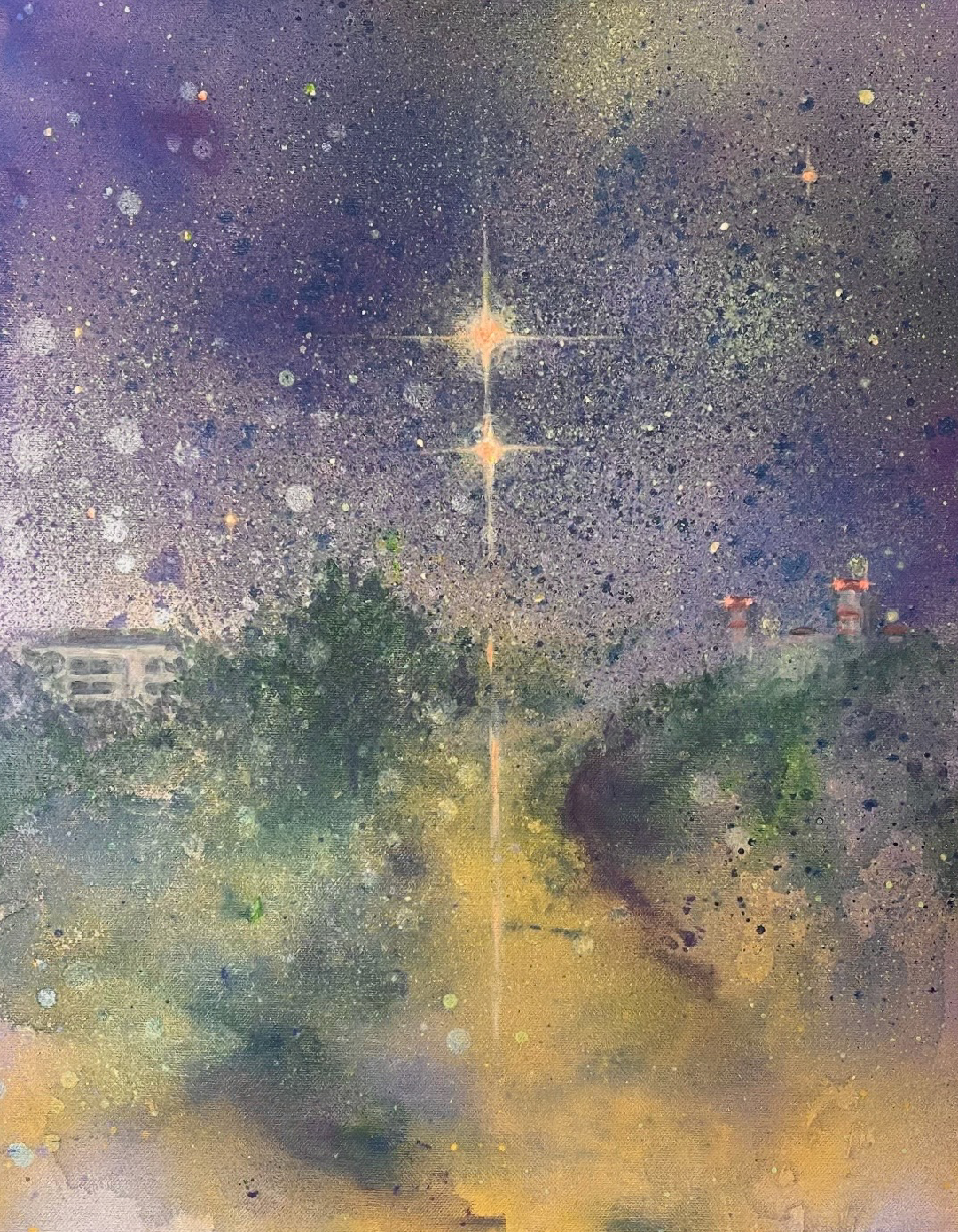 Tento obraz o rozměrech 40x50 cm vznikl jako záznam okamžiku, kdy se na noční obloze setkaly planety Venuše a Jupiter. Část díla jsem tvořila v plenéru, abych do plátna otiskla energii přírody.