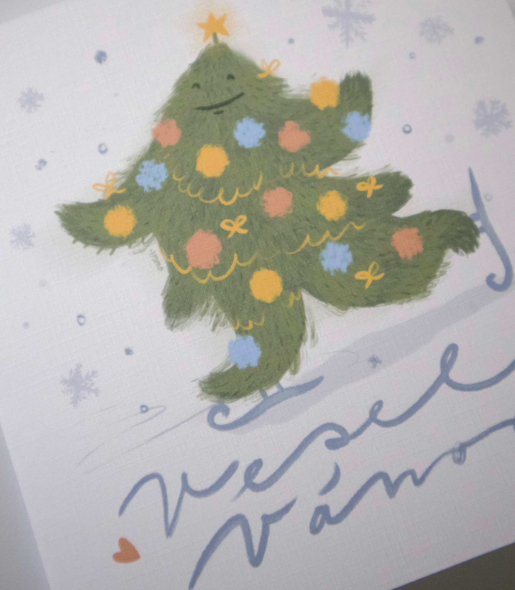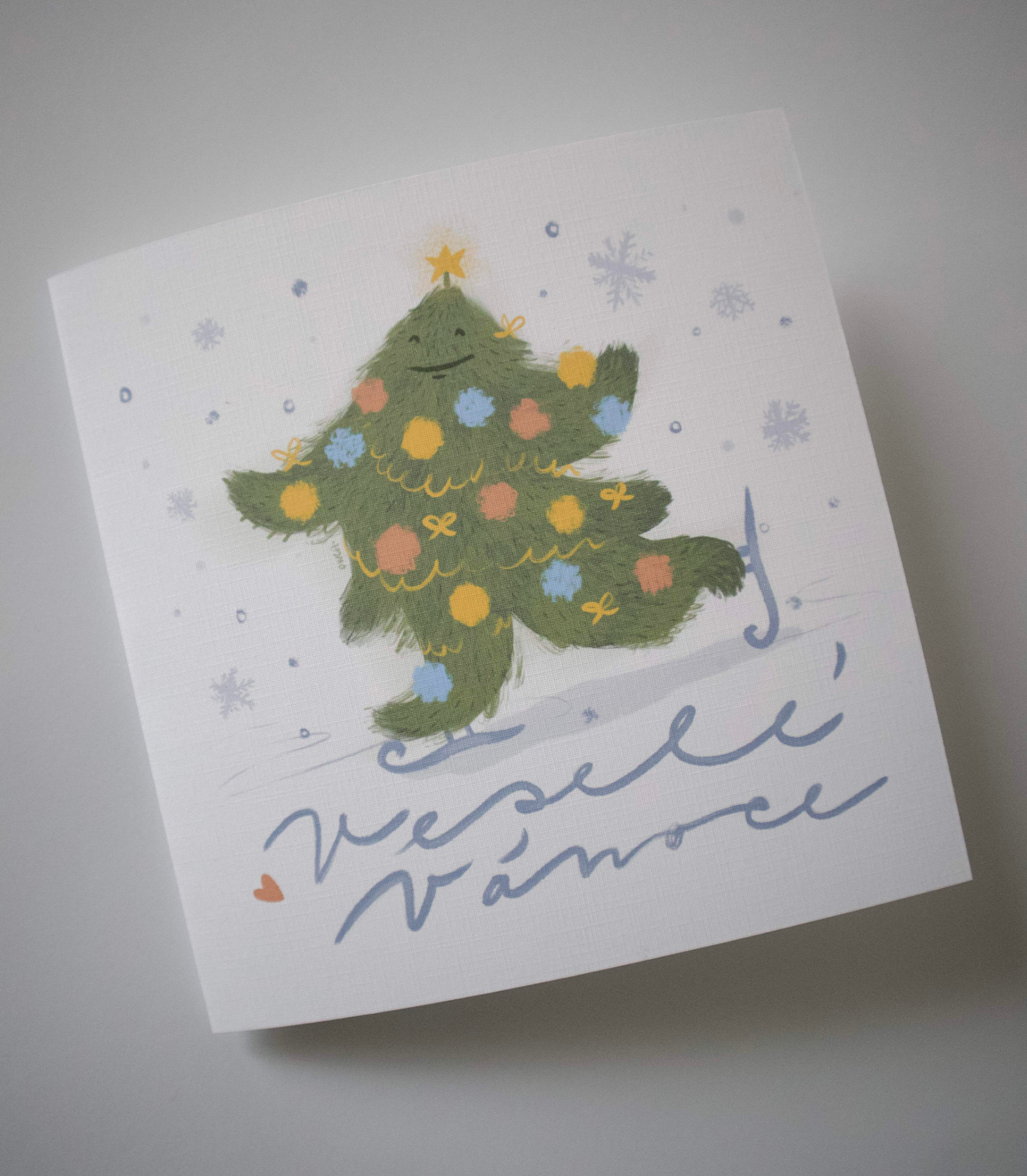 Ilustrované přáníčko "Stromeček bruslí" / 14,3 x 14,3 cm